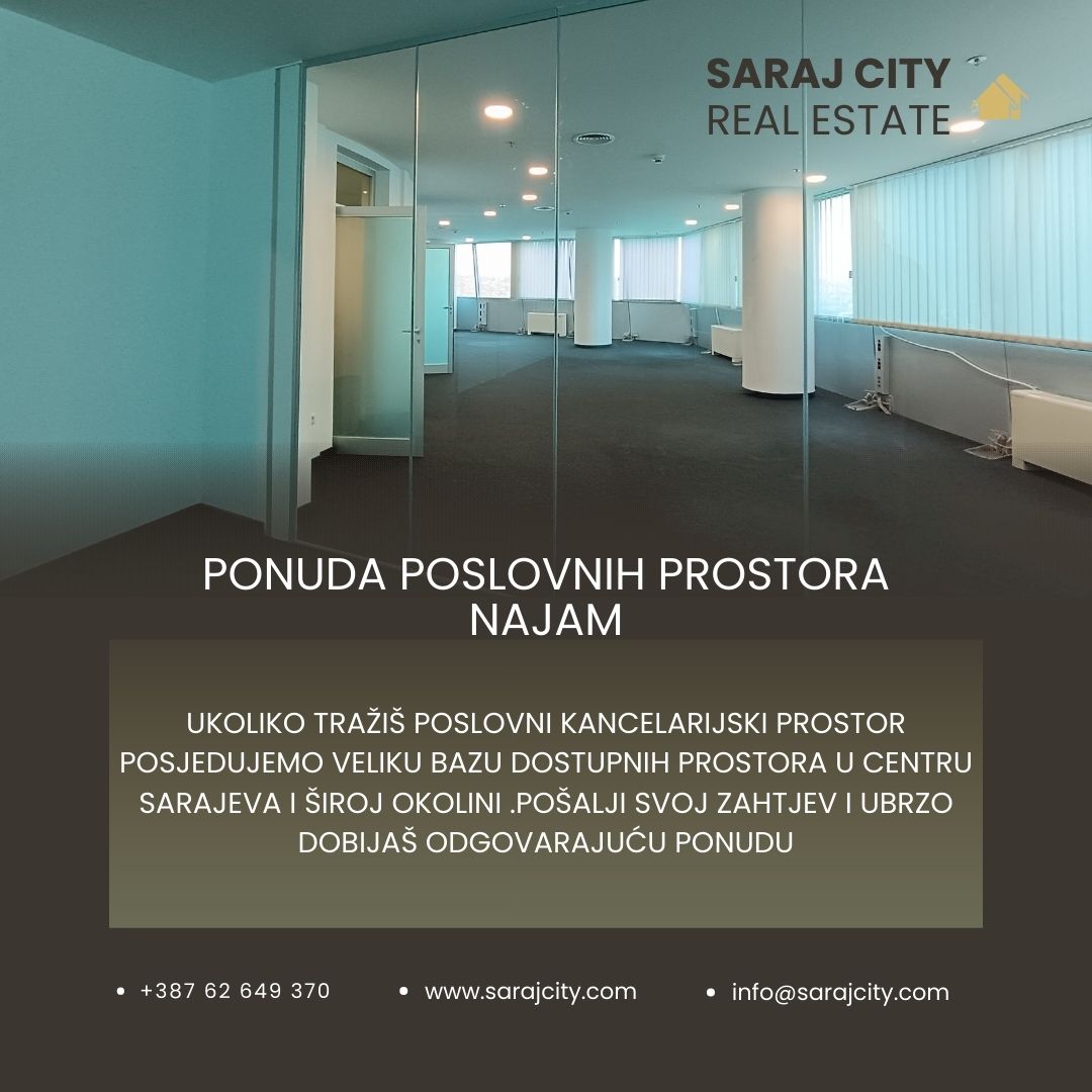 U ponudi imamo veći broj poslovnih prostora za najam . Ukoliko ti je potreban kancelarijski poslovni prostor, možemo ti ponuditi prostore od 30-300 m2 na lokaciji u Centru grada i lokacijama u Novom Gradu .